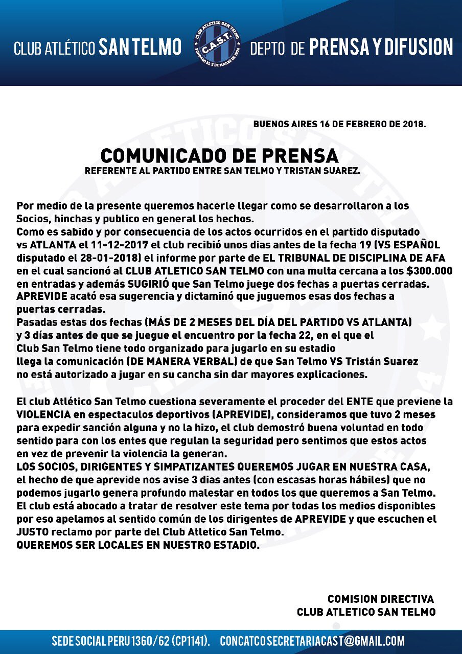 Difundimos Comunicado de Prensa del Club.